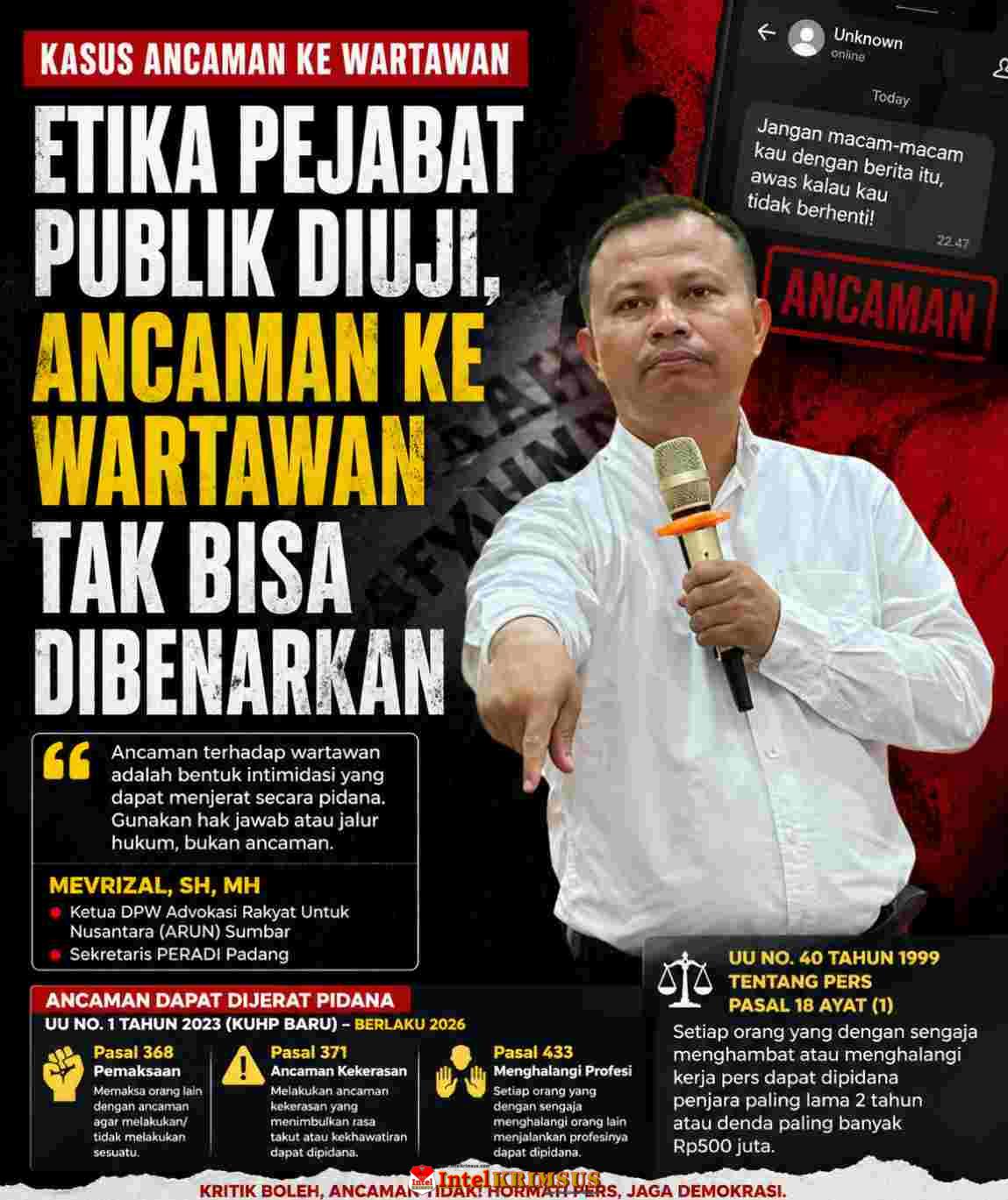 Solok – Sorotan terhadap dugaan pengancaman wartawan oleh seorang anggota DPRD dari Partai Keadilan Sejahtera (PKS) di Kabupaten Solok kian meluas. Tidak hanya memicu kecaman dari kalangan aktivis, peristiwa ini juga menuai perhatian dari praktisi hukum, Mevrizal, SH, MH, yang merupakan Ketua DPW Advokasi Rakyat Untuk Nusantara (ARUN) Sumatera Barat sekaligus Sekretaris PERADI Padang. Ia menilai kasus tersebut sebagai ujian serius bagi etika pejabat publik sekaligus berpotensi memiliki konsekuensi hukum.